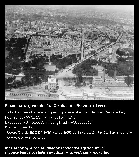 Asilo municipal y cementerio de la Recoleta. - 00/00/1925 - [Id: 891] Fuente:Fotografías de BROSZEIT-BORRA (circa 1925) de la Colección Familia Borra (tomadas de www.Histarmar.com.ar). |