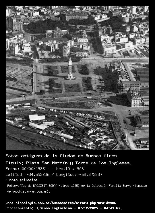 Plaza San Martín y Torre de los Ingleses. - 00/00/1925 - [Id: 906] Fuente:Fotografías de BROSZEIT-BORRA (circa 1925) de la Colección Familia Borra (tomadas de www.Histarmar.com.ar). |