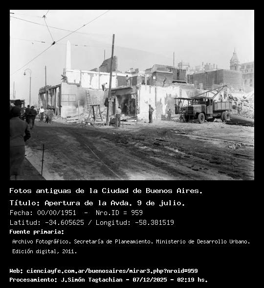Apertura de la Avda. 9 de julio. - 00/00/1951 - [Id: 959] Fuente:Archivo Fotográfico. Secretaría de Planeamiento. Ministerio de Desarrollo Urbano. Edición digital, 2011. |