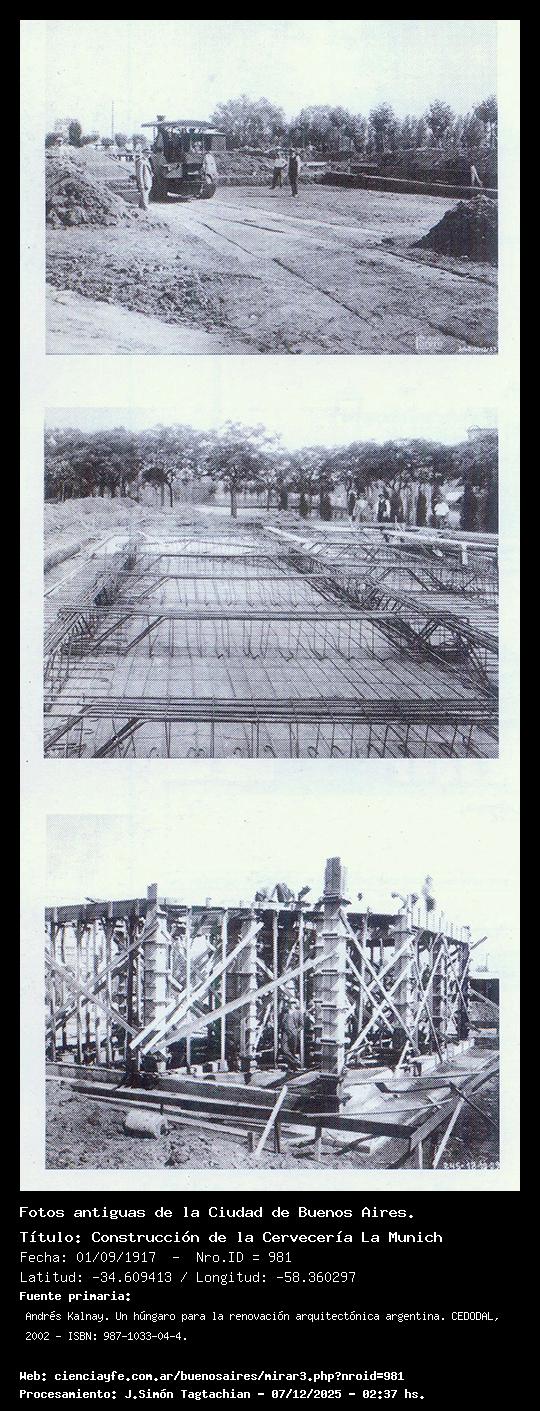 Construcción de la Cervecería La Munich - 01/09/1917 - [Id: 981] Fuente:Andrés Kalnay. Un húngaro para la renovación arquitectónica argentina. CEDODAL, 2002 - ISBN: 987-1033-04-4. |