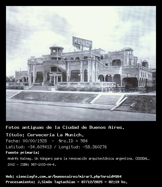 Cervecería La Munich. - 00/00/1928 - [Id: 984] Fuente:Andrés Kalnay. Un húngaro para la renovación arquitectónica argentina. CEDODAL, 2002 - ISBN: 987-1033-04-4. Palabras claves:Kálnay |