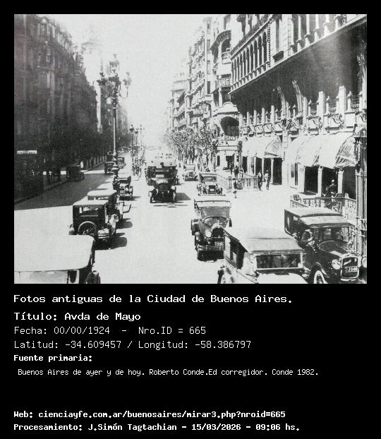 Avda de Mayo - 00/00/1924 - [Id: 665] (Ver la Foto x 2) - (Ver la Foto x 3) - (Exportar foto) La Avda de Mayo se inauguró oficialmente el 9 de julio de 1894 y se concluyó en septiembre (se la conocía como la Avenida). Es la cuadra entre San José y Sáenz Peña. Se ve la 'Singer Sewing Machine co', vecina al Palacio Barolo (construido en 1919. Arq Palanti). Los toldos que se ven corresponden al edificio de La Inmobiliaria. - Fuente:Buenos Aires de ayer y de hoy. Roberto Conde.Ed corregidor. Conde 1982.