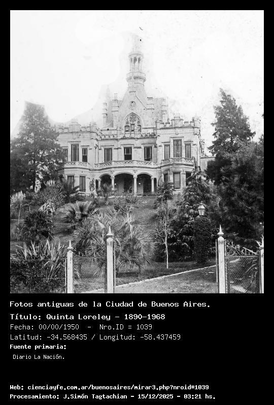 Quinta Loreley - 1890-1968 - Fecha: 00/00/1950 - [Id: 1039] Esta casa-homenaje a la cultura germana fue encargada a comienzos de la última década del siglo XIX por Don Gustavo Napp, destacado hombre de negocios nacido en Alemania en 1825. Autores de los planos fueron los arquitectos Carlos A. y Hans Altgelt, primos segundos entre sí, nacido el primero en Buenos Aires en 1855 y fallecido en Berlín en 1937, en tanto que Hans nació en Berlín en 1855 y murió en Buenos Aires en 1897. Ambos estudiaron arquitectura en Alemania. Loreley presentaba un medievalismo neogótico, construido en la cima de la barranca de un terreno muy profundo que empezaba siendo angosto al 451 de la avenida Cabildo -por donde se accedía- para irse ensanchando hacia el Camino de las Cañitas (hoy Av. Luis María Campos), donde terminaba. (1890-1968). Fuente:Diario La Nación.