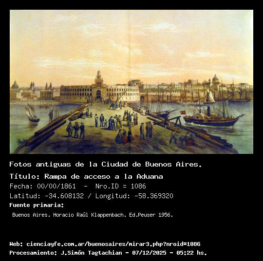 Rampa de acceso a la Aduana - Fecha: 00/00/1861 - [Id: 1086] En primer plano se ve la aduana. A su izquiera, se ven las dos torres de San Ignacio, y más a la izquieda las torres y cúpula de San Francisco. A la derecha, se ve Nuestra Señora de la Merced. Fuente:Buenos Aires. Horacio Raúl Klappenbach. Ed.Peuser 1956.