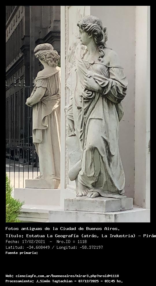 Estatua La Geografía (atrás, La Industria) - Pirámide de mayo - Fecha: 17/02/2021 - [Id: 1118] Las estatuas volvieron a la pirámide de mayo en febrero de 2017. Habían sido removidas en 1912. Estas 4 estatuas pertenecían al grupo de 12 estatuas del ex Banco Provincia, y reemplazaron en su momento a las 4 originales. Desde 1912 a 1970 estuvieron en un galpón. En 1970 las habían ubicado frente a San Francisco. Fuente: