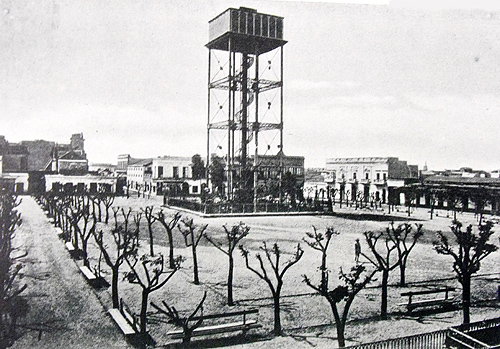 Plaza Lorea y tanque de Agua Corriente - Fecha: /00/1880 - [Id: 277] No pude determinar la orientación de la foto. Fuente:Proyecto Orgánico para la urbanización del Municipio. El plano regulador y de reforma de la Capital Federal. 1925. Talleres Peuser. Buenos Aires.