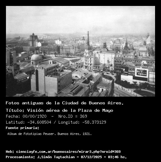 Visión aérea de la Plaza de Mayo - Fecha: 00/00/1920 - [Id: 369] Se ve claramente la Catedral y la Municipalidad, con su inmensa aguja todavía erguida sobre la cúpula. Fuente:Album de Fototipias Peuser. Buenos Aires, 1921.