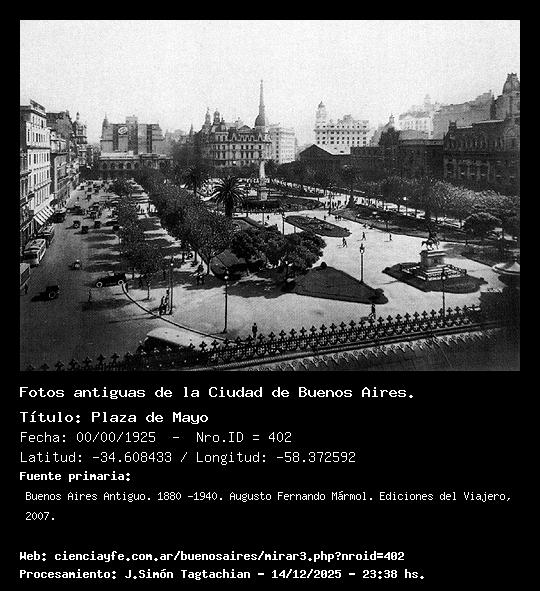 Plaza de Mayo - Fecha: 00/00/1925 - [Id: 402] Tomada desde la Casa Rosada. Fuente:Buenos Aires Antiguo. 1880 -1940. Augusto Fernando Mármol. Ediciones del Viajero, 2007.
