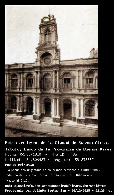 Banco de la Provincia de Buenos Aires - Fecha: 00/00/1910 - [Id: 495] Entre los años 1869 y 1874 se construyó en la Ciudad de Buenos Aires el edificio central del Banco de la Provincia de Buenos Aires, diseñado por los arquitectos Henry Hunt y Hans Schroeder al estilo “italianizante”, predilecto en nuestra región por aquellos años, que se inspiraba estéticamente en la arquitectura y la decoración renacentista de aquel país. Se ubicaba en la calle San Martín 137 a una cuadra de la Catedral Metropolitana. Confrontar (historia de sus estatuas): miradaatenta.wordpress.com/2010/05/13/las-esculturas-del-banco-provincia/ Fuente:La República Argentina en su primer centenario (1810-1910). Edición facisimilar, Colección Panunzi. Ed. Biblioteca Nacional 2010.