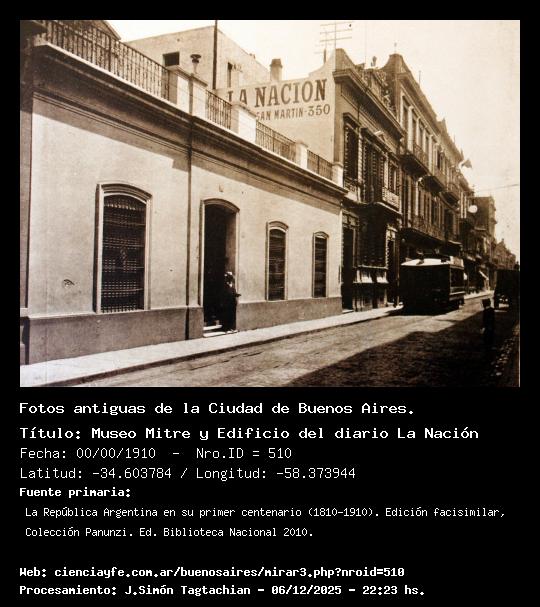Museo Mitre y Edificio del diario La Nación - Fecha: 00/00/1910 - [Id: 510] Diario La Nación, Museo Mitre. Fuente:La República Argentina en su primer centenario (1810-1910). Edición facisimilar, Colección Panunzi. Ed. Biblioteca Nacional 2010.