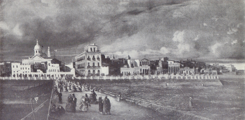 Buenos Aires en 1857 - Fecha: 00/00/1857 - [Id: 585] Muelle de pasajeros. Entrada a Buenos Aires. Se ve claramente la Iglesia de la Merced. Oleo de Calcagneo. Fuente:Exposición de aspectos del Cabildo, Fuerte, Catedral, Recova y Plaza de mayo. Comisión Nacional de Museos y de Monumentos y de Históricos. 1940