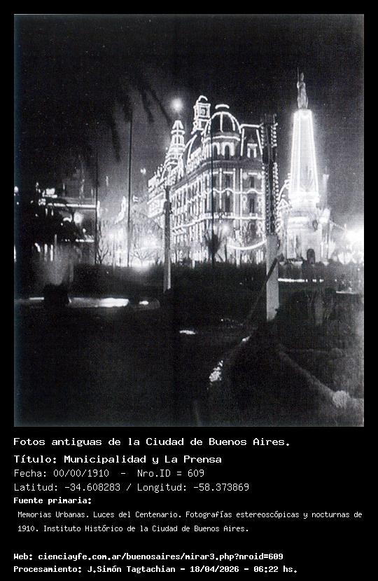 Municipalidad y La Prensa - Fecha: 00/00/1910 - [Id: 609] La pirámide fue diseñada por el alarife Cañete en 1811. En 1856 fue modificada por Prilidiano Pueyrredón quien elevó su altura y coronó el monumento con la Estatua de la Libertad (sic) -diosa Beloma- . También se ve el Palacio Municipal que se hizo en dos etapas: la primera entre 1891 y 1902 a cargo del Ingeniero Juan María Cagnoni -cómo se ve aquí-. La segunda etapa comenzaría en 1911. También se ve la farola encendida del Diario La Prensa. Fuente:Memorias Urbanas. Luces del Centenario. Fotografías estereoscópicas y nocturnas de 1910. Instituto Histórico de la Ciudad de Buenos Aires.