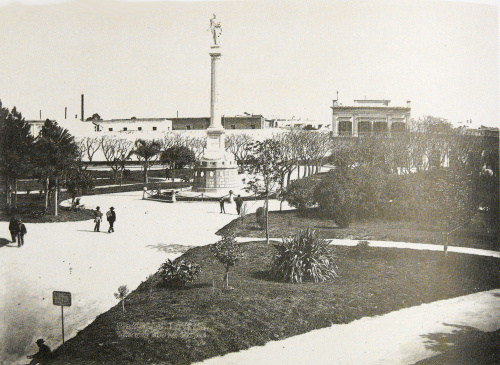 Plaza General Lavalle - Fecha: 00/00/1880 - [Id: 794] El monumento representa al prócer en su pensamiento: el unitarismo. Obra de Pedro Costa. Al fondo se observa el Parque de Artillería, donde se construiría luego el Palacio de Justicia (Tribunales). Fuente:Argentina 1880, SS & CC ediciones. 1982.