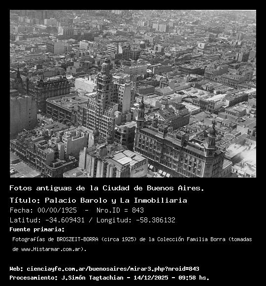 Palacio Barolo y La Inmobiliaria - Fecha: 00/00/1925 - [Id: 843] Fuente:Fotografías de BROSZEIT-BORRA (circa 1925) de la Colección Familia Borra (tomadas de www.Histarmar.com.ar).
