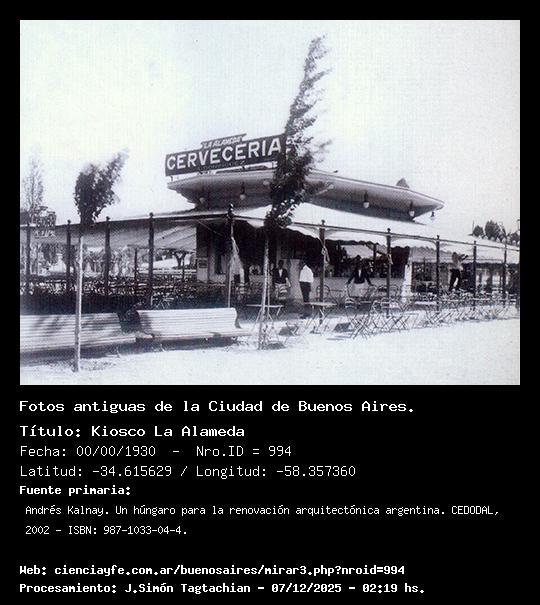 Kiosco La Alameda - Fecha: 00/00/1930 - [Id: 994] Kiosco La Alameda. Tenía un edificio gemelo ubicado frente a él llamado Punch de Naranja (hoy demolido). La fecha de la foto es aproximada. Fuente:Andrés Kalnay. Un húngaro para la renovación arquitectónica argentina. CEDODAL, 2002 - ISBN: 987-1033-04-4.