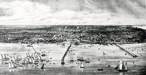Buenos Aires a vuelo de pájaro. - 00/00/1860 - [Id: 291] Fuente:Proyecto Orgánico para la urbanización del Municipio. El plano regulador y de reforma de la Capital Federal. 1925. Talleres Peuser. Buenos Aires. |