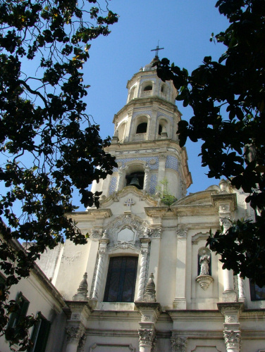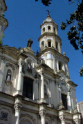 Historia y referencias San Pedro González Telmo. Nació en Frómista, cerca de Palencia (España) en 1175. Siendo muy joven fue consagrado sacerdote y luego eligió la vida religiosa, ingresando a la orden de los dominicos. Se dedicó a la formación de los futuros religiosos de su orden, por eso muchos conventos dominicanos en el mundo están bajo su protección, entre ellos el de Buenos Aires. En sus últimos años, abrazó exclusivamente la vida misionera predicando a los pescadores y navegantes en Galicia y Portugal. Murió en su querida ciudad de Tui en Galicia, en 1246. Su fama de santidad se hizo notar muy elocuentemente con numerosas gracias y promesas concedidas por su protección e intercesión. Oh bendito San Telmo, tú que eres protector de los navegantes, y todos somos navegantes por los mares de la vida, no permitas que naufraguemos, condúcenos a través de las tempestades de nuestra existencia, al puerto seguro de la felicidad eterna. Amén. Una Visita al Templo Nuestra iglesia es una de las más antiguas y pertenece al denominado "casco histórico" de Buenos Aires. Comenzó a edificarse en 1734 bajo la advocación de Nuestra Señora de Belén. En su construcción intervinieran varios jesuitas arquitectos: Andrés Bianchi, Juan Bautista Primoli y José Schmidt y, en su etapa final, el maestro italiano Antonio Masella. La fachada actual es ecléctica, neo barroca, luego de la restauración efectuada por el arquitecto Pelayo Sainz entre 1916 y 1931, quien modificó la sencillez de sus líneas originales. Atrio y Fachada Accedemos desde la calle Humberto 1º por escaleras de mármol al atrio embaldosado a fines del siglo XIX. En sus muros vemos numerosas placas conmemorativas que nos revelan la riqueza de su historia. Antes de ingresar al templo encontramos una lápida que señala la tumba del cuarto párroco, Juan Antonio Martínez, fallecido durante la epidemia de cólera en 1858. El frente presenta dos imponentes torres, divididas en tres secciones. Las inferiores son de forma cúbica y fueron construidas en 1734, y las dos superiores, octogonales, se concluyeron en 1876. Llegan a 40 metros de alto. Tienen influencia andaluza, adornadas con azulejos blancos y azules y con estucos propios del arte plateresco. En su interior se hallan las tres campanas. Entre las dos torres se alza una imagen de San Pedro González Telmo, patrono desde 1806 cuando la iglesia fue erigida en parroquia por el obispo Benito de Lué y Riega. Lleva los símbolos de su intercesión: una nave en la mano izquierda y una vela en la derecha. El Templo Antes de ingresar encontramos la "Capilla de la Fundación" con el primitivo cuadro de Nuestra Señora de Belén (1), que trajo el donante del predio, don Ignacio Bustillo y Ceballos en 1734, copia auténtica del que se veneraba en el antiguo hospital Antón Martín, de Madrid. Allí también veneramos la imagen del Santo Hermano Pedro de Betancur, fundador de la orden de los hermanos betlehemitas, a quienes se entregó el templo en 1795 para continuar el culto y organizar un hospital. El templo, que impacta por su magnificencia y calidez, tiene una planta de cruz latina, cúpula coronando el crucero y capillas en las naves laterales. La nave central tiene techo de medio punto con arcos apoyados en gruesos pilares. Mide 44,20x9,45 metros. En 1767, año de la expulsión de los jesuitas, faltaban concluir las torres y la cúpula. La liturgia se celebraba en la nave izquierda o de San José. Antes del crucero encontramos dos obras artísticas, de distintas épocas: el púlpito y el comulgatorio. El primero fue encargado para San Telmo por Manuel Belgrano, en 1805, al artista español Manuel Gaspar Hernández. Es de forma octogonal y en sus recuadros figuran las imágenes de los evangelistas con sus atributos y el escudo betlehemita. En su parte superior (claravoce) vemos la paloma que simboliza al Espíritu Santo. Remata en un ángel, obra de las misiones jesuíticas. Todo el conjunto es de madera tallada y pintada con láminas de oro y esmalte. El gran comulgatorio es de mármol de Carrara y fue colocado en 1903. La cúpula fue concluida en 1858. Tiene 38,40 m. de altura, con cuatro ventanas y linterna. En uno de los pilares en que descansa hay un nicho que contiene una reliquia de San Pedro Telmo. Ya en el presbiterio admiramos el retablo, con el antiguo altar mayor adosado. Lo construyó el tallista José Merlang, en 1833. Su parte inferior está adornada con altorrelieves dorados a la hoja, que representan motivos marinos que nos recuerdan el patrocinio de San Telmo sobre los hombres del mar. Luego, en sus tres hornacinas, separadas por ocho columnas corintias, están las imágenes de San Telmo, a la izquierda, de San Juan de Dios, a la derecha y en el centro Nuestra Señora de Belén, del artista veneciano Carlos Preboran, de 3 m. de altura, en madera policromada, entronizada el 15 de agosto de 1903. Por encima, un óleo de la Sagrada Familia y, coronando todo el conjunto, la Santísima Trinidad. En el baldaquín, una cruz de estilo portugués, del s. XVIII. Flanquean el altar mayor dos imágenes de las misiones jesuíticas: a la izquierda San Agustín y a la derecha San Nicolás. En el centro del presbiterio se halla el altar fijo y la sede del celebrante. En las naves laterales hay nueve altares de distintas épocas. A la izquierda del altar mayor se encuentra la reserva del Santísimo Sacramento (2), con una imagen española de San José con el niño Jesús dormido en sus brazos. Siguen los altares laterales del Calvario (3), Santa Ana (4) y Nuestra Señora del Carmen (5). En el del Calvario o del Gólgota se encuentra la graciosa imagen de Nuestra Señora de los Remedios, talla de vestir con cabello natural, que perteneció durante la colonia a los frailes Betlehemitas y en su parte superior observamos un óleo del s. XVIII del patrono de nuestra ciudad, San Martín de Tours. Sobre la puerta histórica que unía la iglesia con el claustro distingu